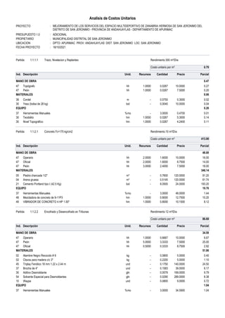Este documento presenta un análisis de costos unitarios para el proyecto de mejoramiento de los servicios del espacio multiusos de Zanabria Hermosa en San Jerónimo, Perú. Incluye costos de mano de obra, materiales y equipos para partidas como trazo y replanteo, concreto, encofrado, acero, instalación de mallas y redes, barandas, juegos infantiles, excavación, nivelación, relleno y acarreo de materiales. El presupuesto proporciona detalles precisos sobre los recursos