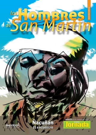 El documento describe el encuentro entre José de San Martín y el cacique pehuenche Ñacuñán en 1816. San Martín buscaba la alianza de los pehuenches para que le permitieran cruzar su territorio y también para que propagaran la noticia falsa de que planeaba atacar Chile por el sur, distrayendo así a las fuerzas españolas. Aunque desconfiaba de los blancos, Ñacuñán confió en San Martín y aceptó su alianza, aunque tres de sus capitanes se opusieron. Más tarde,