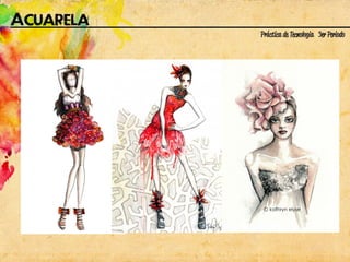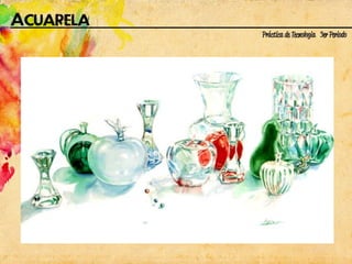 Este documento proporciona información sobre la técnica de acuarela, incluyendo sus orígenes históricos, ventajas, desventajas, técnicas como veladuras y degradados, y ejemplos de artistas que usaron acuarela.