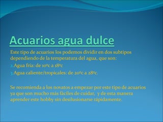 Este documento describe diferentes tipos de acuarios, incluyendo acuarios de agua dulce tropical, agua fría, salobre y marinos. Recomienda a principiantes empezar con acuarios de agua dulce tropical porque son más fáciles de mantener. También enumera los elementos básicos necesarios para montar un acuario de agua dulce tropical, como calentador, filtración, iluminación, plantas, peces, sustrato y decoraciones.
