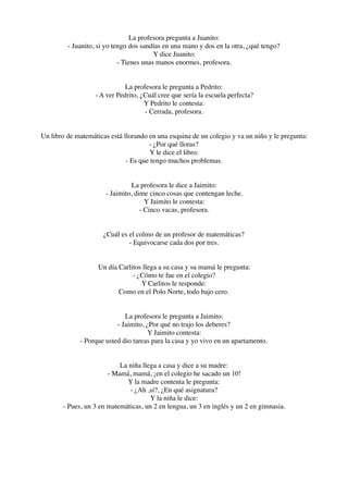Este documento contiene una serie de diálogos cómicos entre profesores y alumnos en los que los alumnos responden de manera ingeniosa o evasiva a las preguntas de los profesores. Los alumnos utilizan juegos de palabras, dobles sentidos y excusas poco convencionales para esquivar dar respuestas directas o admitir cuando no han hecho los deberes. El documento intenta provocar la risa a través de estas interacciones divertidas donde los alumnos parecen más astutos que los profesores.