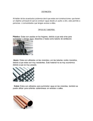 Este documento describe diferentes tipos de tuberías y conexiones utilizadas en acueductos. Explica que las tuberías de plástico, acero, cobre, fibrocemento, acero galvanizado, hierro fundido y hormigón se usan comúnmente en acueductos y viviendas. También detalla las funciones de conexiones como las ye, coplas, codos, niples y tees. Por último, cubre criterios para el consumo real estimado, variaciones horarias y gastos de incendio en el diseño de acueductos.