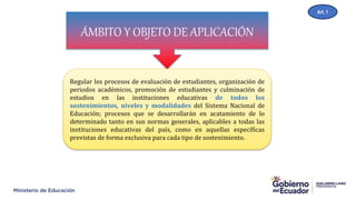 Este documento establece las normas para la evaluación, permanencia y promoción de estudiantes en el Sistema Nacional de Educación. Se regulan los procesos de evaluación aplicables a todas las instituciones educativas, así como normas específicas para instituciones fiscales, fiscomisionales, municipales y particulares. Se describen tipos de evaluación, herramientas de evaluación de aprendizajes y aspectos socioemocionales, así como mecanismos para mejorar calificaciones.