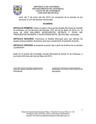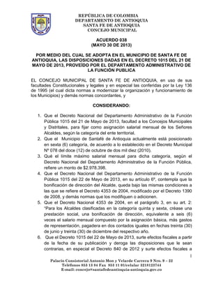 Este documento es un acuerdo del Concejo Municipal de Santa Fe de Antioquia, Colombia en el que se adoptan las disposiciones del Decreto 1015 de 2013 expedido por el Departamento Administrativo de la Función Pública. El acuerdo fija el salario mensual del Alcalde de Santa Fe de Antioquia en $2.978.398 de acuerdo a la categoría del municipio y autoriza al Alcalde a realizar ajustes presupuestales para cumplir con lo establecido en el acuerdo.