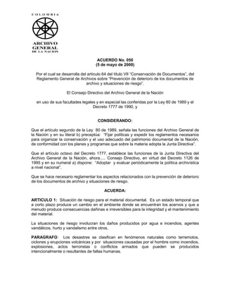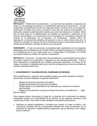 Este documento establece lineamientos para prevenir el deterioro de documentos de archivo y situaciones de riesgo como incendios e inundaciones. Incluye definir un plan de prevención que identifique peligros, establezca medidas preventivas como detección de humo y mantenimiento de sistemas, y prepare un plan de emergencia. También cubre cómo reaccionar ante siniestros mediante el control de pánico, notificación a servicios de emergencia y evaluación de daños para iniciar acciones de recuperación como secado y desinfección