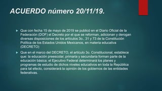 Este documento resume los cambios realizados al Acuerdo número 12/10/17 por el que se establece el plan y los programas de estudio para la educación básica mediante el Acuerdo número 20/11/19. Se modifican aspectos relacionados con la denominación del acuerdo anterior, la inclusión de la asignatura de Tecnología en secundaria, y se reforman diversos programas de estudio de las áreas de Formación Académica y Exploración y Comprensión del Mundo Natural y Social.