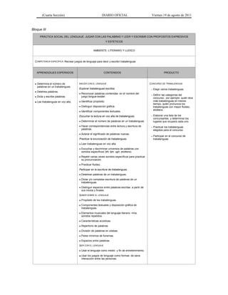 El documento presenta cuatro bloques que describen actividades de lenguaje para estudiantes de educación básica. Cada bloque incluye aprendizajes esperados, contenidos, y productos relacionados con prácticas como resumir diálogos, jugar con trabalenguas, formular preguntas para obtener información, e interpretar expresiones para ofrecer y pedir ayuda.