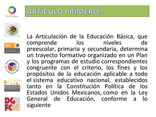 El documento establece los lineamientos de la Articulación de la Educación Básica en México, la cual comprende los niveles de preescolar, primaria y secundaria. Se basa en cinco puntos esenciales y busca definir un perfil de egreso común para estos niveles educativos que promueva el desarrollo de competencias en los estudiantes.