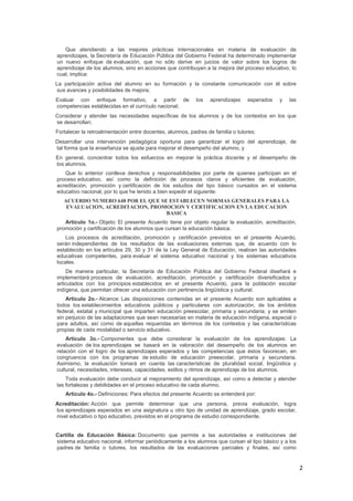 Este documento establece normas generales para la evaluación, acreditación, promoción y certificación en la educación básica en México. Define componentes como niveles de desempeño, momentos de evaluación, y contenido de la Cartilla de Educación Básica para preescolar, primaria y secundaria. El objetivo es regular estos procesos de manera unificada a nivel nacional mientras se adaptan a contextos específicos, y orientarlos hacia la mejora continua del aprendizaje de los estudiantes.