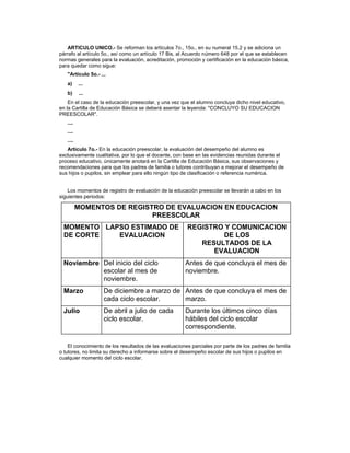 Este documento modifica el Acuerdo número 648 sobre normas generales para la evaluación, acreditación, promoción y certificación en la educación básica. Los cambios incluyen: 1) reformular los criterios de evaluación en preescolar para ser cualitativos en lugar de numéricos, 2) establecer momentos de evaluación en preescolar, y 3) permitir la promoción automática en primero a tercero de primaria y expedir un Certificado de Educación Primaria.