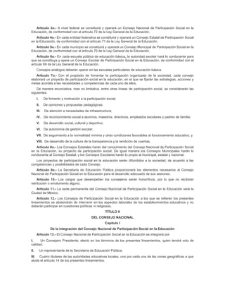 Este documento establece los lineamientos para la constitución, organización y funcionamiento de los Consejos de Participación Social en la Educación a nivel nacional, estatal, municipal y escolar en México. Define la integración y funciones del Consejo Nacional de Participación Social en la Educación y los demás consejos. El objetivo es fomentar la participación de la sociedad y diferentes actores en el proceso educativo.