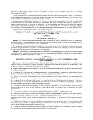 Este documento establece lineamientos para fortalecer la autonomía de gestión de las escuelas de educación básica en México. Los lineamientos buscan que las escuelas se centren en mejorar la calidad educativa y lograr los aprendizajes de todos los estudiantes. También buscan que las autoridades educativas apoyen a las escuelas con infraestructura, recursos y capacitación docente para cumplir con una "Normalidad Mínima de Operación" que garantice la enseñanza efectiva todos los días del ciclo escolar. Final