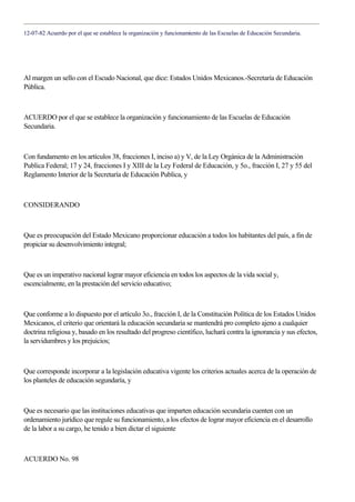 Este documento establece la organización y funcionamiento de las Escuelas de Educación Secundaria en México. Define las responsabilidades y objetivos de estas escuelas, así como la estructura de su personal, incluyendo las funciones del director y subdirector. También describe los procesos de supervisión de estas escuelas por parte de la Secretaría de Educación Pública a nivel federal y estatal.