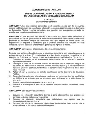 Este documento establece las disposiciones generales para la organización y funcionamiento de las escuelas secundarias en México. Define que las escuelas secundarias deben proporcionar educación básica y formativa para promover el desarrollo integral de los estudiantes. Describe los diferentes tipos de escuelas secundarias y las responsabilidades de las autoridades educativas, directores, maestros y personal. También especifica los requisitos y funciones del personal de las escuelas secundarias.