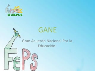 El GANE (Gran Acuerdo Nacional por la Educación) es una propuesta del gobierno chileno para mejorar la calidad, acceso y financiamiento de la educación superior. Busca establecer mejores sistemas de acreditación, información y supervisión de instituciones, así como aumentar becas, disminuir intereses de créditos estudiantiles y crear nuevos fondos. Sin embargo, la propuesta se enfoca solo en educación superior y no aborda las demandas de los estudiantes secundarios.