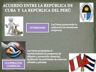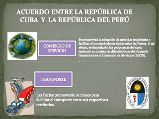 Este documento presenta un acuerdo de complementación económica entre Perú y Cuba. Establece preferencias arancelarias recíprocas para productos negociados y la eliminación de restricciones no arancelarias. También incluye cláusulas de salvaguardia para proteger a industrias nacionales de importaciones que causen daño, y disposiciones contra prácticas desleales de comercio. El acuerdo entró en vigor en 2001 y la autoridad responsable de brindar información es el Viceministerio de Comercio Exterior del Perú
