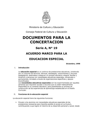 Este documento establece un acuerdo marco para la educación especial en Argentina. Define la educación especial como un conjunto de servicios y estrategias destinados a garantizar un proceso educativo integral para personas con necesidades educativas especiales. Describe las funciones de la educación especial y los criterios para la transformación del sistema, incluyendo proveer las prestaciones necesarias para que los estudiantes puedan acceder al plan de estudios y promover la integración e inclusión. También detalla los diferentes tipos de servicios y prestaciones de educación especial.