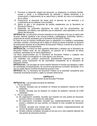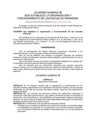Este documento establece la organización y funcionamiento de las escuelas primarias en México. Define las diferentes clasificaciones de escuelas primarias por ubicación, organización, permanencia de los alumnos, alumnado atendido, sexo, dependencia económica y turno de trabajo. También describe la desconcentración de las escuelas primarias dependientes de la Secretaría de Educación Pública y las responsabilidades de los directores de las escuelas.