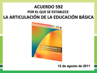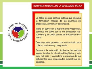 Este documento establece la Articulación de la Educación Básica en México, la cual comprende los niveles de preescolar, primaria y secundaria. Determina un trayecto formativo organizado en un Plan de Estudios y programas de estudio aplicables a todo el sistema educativo nacional. Dicho Plan y programas se orientan al desarrollo de competencias para la vida de los estudiantes mexicanos y definen los Estándares Curriculares y aprendizajes esperados para cada nivel educativo, en congruencia con los fines y prop