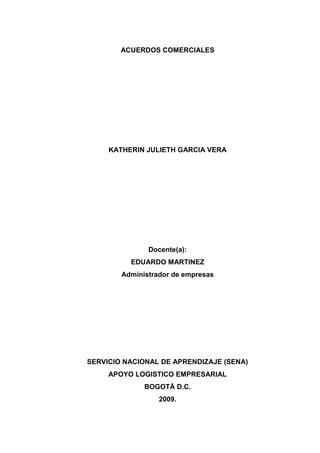 El documento resume los principales acuerdos comerciales actuales y potenciales de Colombia. Entre los acuerdos actuales se encuentran el ATPA y APTDEA con Estados Unidos, el SGP Andino con la Unión Europea, y acuerdos de libre comercio con la CAN, Chile, Venezuela y México. Otros acuerdos potenciales son con el Mercosur y un posible TLC con Estados Unidos y un Área de Libre Comercio de las Américas.