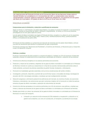 El Protocolo de Kioto establece objetivos legalmente vinculantes para que las naciones industrializadas reduzcan al menos un 5% de sus emisiones de seis gases de efecto invernadero. Incluye mecanismos como el comercio de emisiones para facilitar el cumplimiento. También propone políticas como mejorar la eficiencia energética, proteger sumideros de carbono y fomentar energías renovables para promover el desarrollo sostenible.