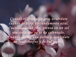Este documento alienta al lector a recordar los buenos momentos de su vida cuando se sienta triste o derrotado. Aconseja concentrarse en recuerdos placenteros como días soleados, muestras de afecto, paisajes hermosos y risas compartidas en lugar de pensamientos dolorosos. Recomineda revivir estas experiencias positivas en la mente para volver a sentir la alegría y la paz que aportaron.