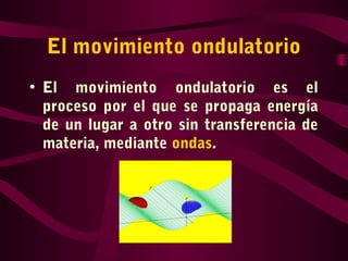 El documento describe los conceptos básicos del movimiento ondulatorio y las ondas acústicas. Explica que existen dos tipos principales de ondas: longitudinales y transversales. Las ondas longitudinales, como las ondas sonoras, hacen que el medio se mueva en la dirección de propagación, mientras que las ondas transversales hacen que el medio se mueva perpendicularmente. También describe elementos clave como la frecuencia, longitud de onda, amplitud e intensidad de las ondas sonoras.