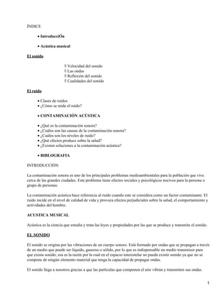 Este documento describe la contaminación acústica y sus causas. Explica que la contaminación acústica se refiere al ruido que causa efectos perjudiciales y afecta la calidad de vida. Las principales causas son el tráfico (80% del ruido), la industria (10%) y actividades humanas como conversaciones y música. España tiene altos niveles de contaminación acústica, especialmente en ciudades entre 10.000 y 500.000 habitantes, donde casi la mitad sufren este problema.