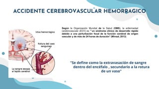 Este documento resume los tipos principales de accidente cerebrovascular hemorrágico. Describe una hemorragia intraparenquimatosa, que ocurre cuando se rompe un vaso sanguíneo dentro del cerebro, causando una extravasación de sangre. También describe una hemorragia subaracnoidea, que ocurre cuando se rompe un vaso en el espacio que rodea al cerebro. Explica los factores de riesgo, síntomas, diagnóstico, tratamiento y pronóstico de ambos tipos de accidente cerebrovascular hemorrágico