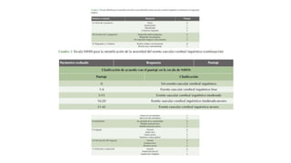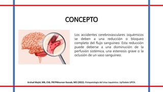 El documento describe la fisiopatología del accidente cerebrovascular isquémico. Se define como una reducción del flujo sanguíneo cerebral que puede deberse a trombosis, embolia o hipoxia. Se detallan las causas, clasificaciones, manifestaciones clínicas según la localización vascular afectada, exámenes auxiliares, criterios para trombólisis y manejo general del paciente.