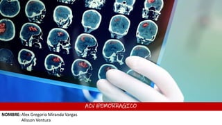 El documento proporciona información sobre el accidente cerebrovascular hemorrágico. Define el ACV hemorrágico como un derrame de sangre dentro del parénquima encefálico causado por una rotura vascular. Describe que las hemorragias se clasifican según su ubicación y la patología vascular subyacente. Además, explica que la hipertensión arterial es el principal factor de riesgo modificable para este tipo de ACV.
