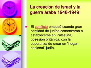 El conflicto árabe-israelí comenzó cuando muchos judíos comenzaron a establecerse en Palestina, entonces bajo control británico, con la esperanza de crear un hogar nacional judío. La partición de Palestina acordada por la ONU en 1947 llevó a la guerra entre los nuevos estados de Israel y los países árabes vecinos. Israel logró sobrevivir e incluso expandir su territorio a pesar de las probabilidades, mientras que la ONU desempeñó un papel importante para poner fin al conflicto.