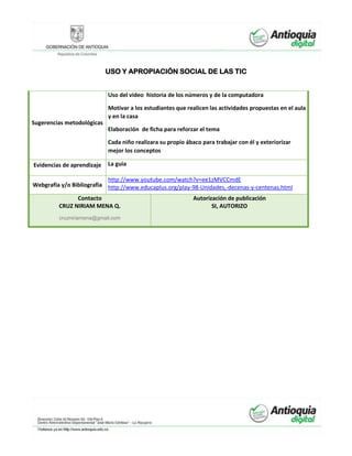 Este documento presenta una agenda didáctica para enseñar centenas a estudiantes de segundo grado. La agenda incluye objetivos, actividades y recursos para desarrollar la capacidad de contar, leer, escribir y ordenar números naturales hasta 999 usando el valor posicional de cada cifra. Las actividades propuestas son ver un video sobre la invención de los números, trabajar con el sistema de numeración decimal y jugar un juego en línea sobre unidades, decenas y centenas.