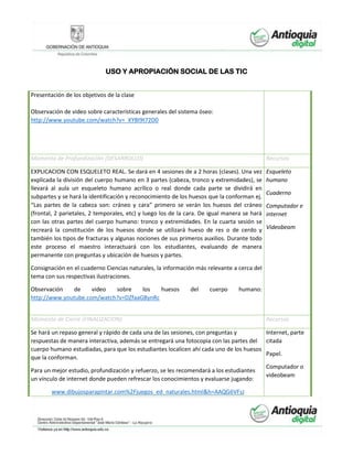 Este documento presenta una agenda didáctica de 10 horas para enseñar a estudiantes de quinto grado sobre el sistema óseo humano. La agenda incluye actividades como un juego para motivar a los estudiantes, explicaciones con un esqueleto real para identificar los huesos, y videos e internet para reforzar el aprendizaje. El objetivo es que los estudiantes puedan distinguir las partes del cuerpo y los huesos que las conforman.