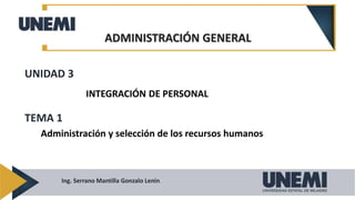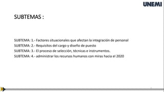Este documento trata sobre la administración y selección de recursos humanos. Explica factores como los requisitos del puesto, el diseño del puesto, y el proceso de selección. El objetivo es conocer los pasos para integrar personal idóneo que potencie el éxito empresarial. Describe conceptos como los factores internos y externos que afectan la integración, las habilidades necesarias en los administradores, y la importancia de alinear a los candidatos con los requisitos del puesto.