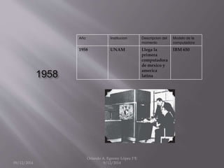 El documento presenta una tabla cronológica de los principales hitos en el desarrollo de la computación en México e internacionalmente entre 1958 y 2003, incluyendo el año, institución involucrada, breve descripción del momento y modelo de computadora asociado. Se destacan eventos como la llegada de la primera computadora a México en 1958, la creación del Centro Nacional de Cómputos en el IPN en 1961, y el lanzamiento de la primera estación espacial Salyut-1 por la Unión Soviética en 1970.
