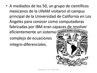 El documento describe brevemente la historia temprana de la computación en México. En la década de 1950, científicos mexicanos visitaron UCLA para ver cómo las computadoras IBM resolvían ecuaciones. En 1958, México adquirió su primera computadora digital IBM-650. En las décadas siguientes, universidades mexicanas como el IPN y el ITESM adquirieron computadoras más avanzadas y comenzaron a ofrecer programas en ingeniería y ciencia de la computación.