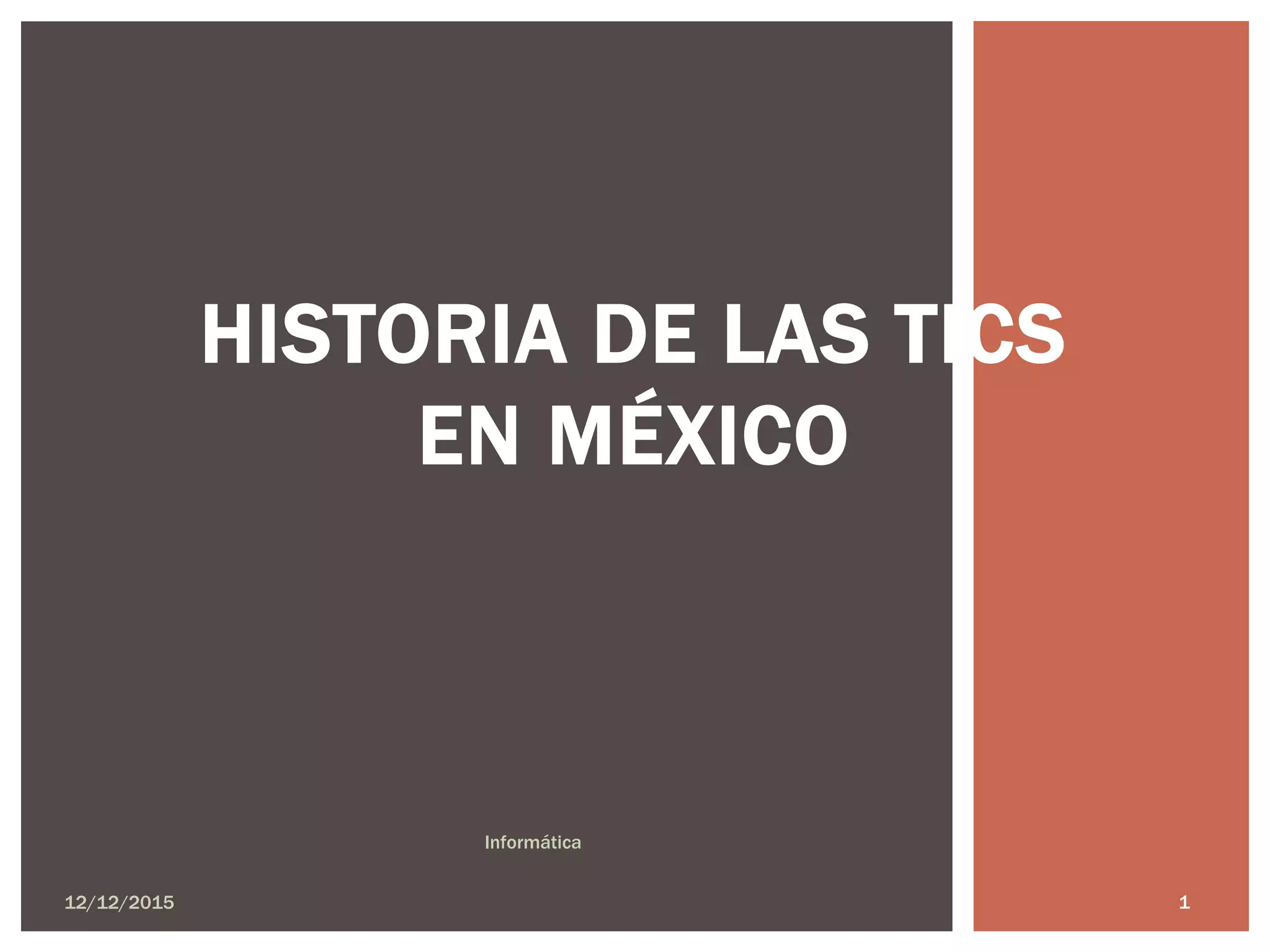 El documento resume brevemente la historia de las tecnologías de la información y la comunicación en México desde la llegada de la primera computadora a la UNAM en 1953 hasta el año 2003, mencionando hitos como la creación del Centro Nacional de Cálculo en 1958, la introducción del teclado y mouse en 1961, el desarrollo de ARPANET en 1968, y el surgimiento de los primeros sistemas operativos y supercomputadoras en los años 90 y 2000.