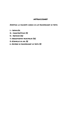 El documento detalla las características, ventajas y ejemplos de uso de los procesadores de texto, enfatizando su rol como herramientas esenciales para la creación y edición de documentos en diversas formas. Se describen funcionalidades clave como inserción, formato, corrección y organización de textos, además de beneficios como la facilidad de uso y la posibilidad de trabajar con versiones y plantillas. Se presentan también ejemplos de distintos procesadores de texto, incluyendo Microsoft Word, Google Docs y otros programas que atienden necesidades específicas de los usuarios.
