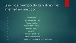 Este documento presenta una línea de tiempo que resume la historia del internet en México desde 1987 hasta el 2000. Algunos hitos clave incluyen la conexión de la UNAM a BITNET en 1987, la primera conexión de internet en México a través del ITESM en 1989, el establecimiento del servidor para el dominio .mx en 1992, y el crecimiento rápido del número de usuarios de internet en México durante la década de 1990.
