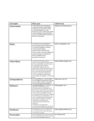 El documento define varios conceptos clave relacionados con la informática. Explica que la información está compuesta por datos ordenados que sirven para construir mensajes, y que los datos son símbolos que pueden ordenarse en información. También define conceptos como informática, computadoras, software, hardware, procesador, sistema operativo, archivos, redes, Internet, USB y multimedia.