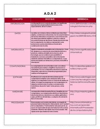 Este documento proporciona definiciones breves de varios conceptos clave de informática, incluyendo información, datos, informática, computadoras, software, hardware, procesador, sistema operativo, archivos, redes, Internet, USB y multimedia. Explica que la información es un conjunto de datos con significado, la informática es el tratamiento automático de la información, y que el hardware y el software son componentes fundamentales de las computadoras.