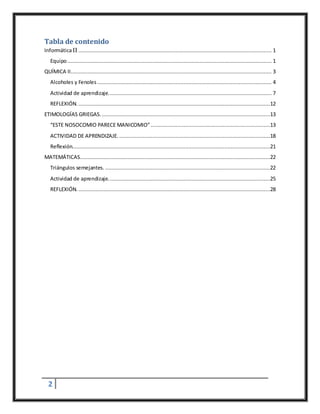 Este documento presenta los proyectos de 7 asignaturas cursadas por el equipo Melocotongos en el segundo bloque. Incluye temas de química como alcoholes y fenoles, etimologías griegas con ejemplos de pseudoprefijos y pseudosufijos, y proyectos de matemáticas y otras asignaturas con actividades de aprendizaje y reflexiones.