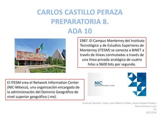 El documento resume brevemente la historia del desarrollo de Internet en México desde 1987 hasta el año 2000, destacando hitos como la primera conexión del ITESM en 1987, la conexión de la UNAM en 1990, la creación del NIC-México en 1995 y el rápido crecimiento de dominios .mx entre 1994 y 1996. Para el año 2000, Internet se había vuelto parte de la vida cotidiana de los mexicanos en la mayoría de los centros urbanos.