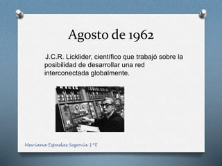 El documento resume la historia del desarrollo de Internet desde 1962 hasta la actualidad. Comenzó con investigaciones en 1962 sobre redes interconectadas, la primera red de computadoras en 1965, e implementaciones tempranas de ARPANET en 1969. En 1972 se añadió el correo electrónico, y en 1983 todas las máquinas debían usar TCP/IP. México se conectó a Internet en 1989, y ha crecido para convertirse en un elemento clave en el entorno mundial digitalizado de hoy.