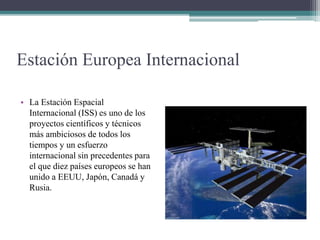Estación Europea Internacional • La Estación Espacial Internacional (ISS) es uno de los proyectos científicos y técnicos más ambiciosos de todos los tiempos y un esfuerzo internacional sin precedentes para el que diez países europeos se han unido a EEUU, Japón, Canadá y Rusia.