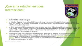 La Estación Espacial Internacional (ISS) es un proyecto científico y tecnológico ambicioso de diez países europeos junto a EEUU, Japón, Canadá y Rusia. La ISS pesa cerca de 500 toneladas, mide más de 100 metros de largo y ofrece 1.000 metros cúbicos de espacio habitable a 400 km sobre la Tierra para realizar investigaciones científicas que no serían posibles de otra forma. Airbus Defence and Space lidera la parte europea del proyecto y es contratista principal de dos elementos