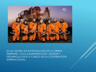 La Estación Espacial Internacional (EEI) es un centro de investigación internacional en órbita terrestre bajo administración cooperativa. Mide aproximadamente 109 metros de largo y 88 metros de ancho, con una masa de 420 toneladas. Puede albergar hasta seis astronautas y es abastecida de energía por los paneles solares más grandes jamás construidos.