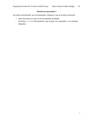 Este documento contiene las actividades realizadas por una estudiante como parte de un curso de informática. Incluye resúmenes de cuatro actividades previas sobre la historia de las computadoras y su evolución, conceptos clave de informática, y categorías y ejemplos de software. También incluye una recomendación de comprar una computadora debido a su gran utilidad para la escuela, el trabajo y el entretenimiento.