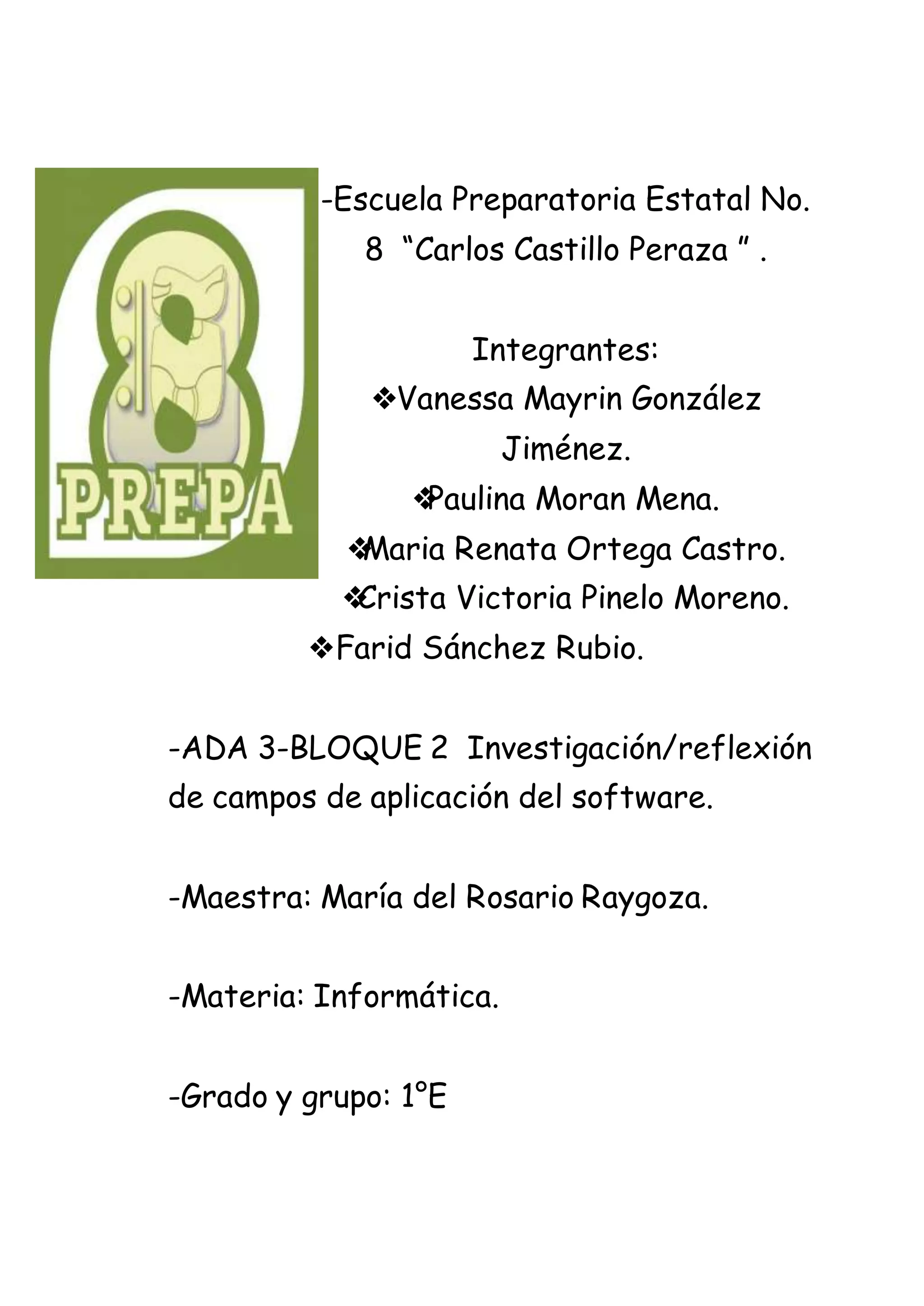 Este documento trata sobre diferentes tipos de software. Presenta una investigación realizada por estudiantes de la Escuela Preparatoria Estatal No. 8 “Carlos Castillo Peraza” sobre campos de aplicación del software como sistemas de software científicos e ingenieriles, de inteligencia artificial y tiempo real. Define cada tipo de software e identifica sus usos principales y características.